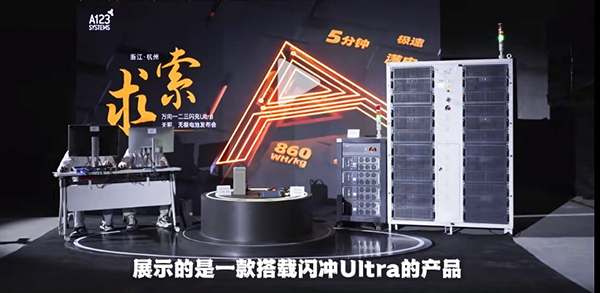 星云150V 400A模组充放电测试系统(右一)、星云10V300A电芯充放电测试系统(右二)出现在万向一二三12C超高倍率“闪充Ultra电池”发布会视频中
